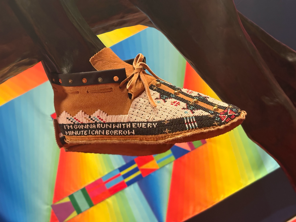 As one proceeds further through the exhibit, music begins to build, emanating from a room next to the exit. The central piece is a bronze Native warrior atop a horse. Both the warrior and horse lean forward, toppling with exhaustion and defeat, yet still fighting, unyielding. The sculpture was originally made by twentieth-century artist Charles Cary Rumsey to represent the genocide of Indigenous people under European colonialism. As part of this exhibition, however, Gibson added soft, beaded moccasins on the man’s feet. Embroidered with the words “I’m gonna run with every minute I can borrow,” their addition represents the perseverance of Indigenous people, and their continued presence and livelihood in the United States.