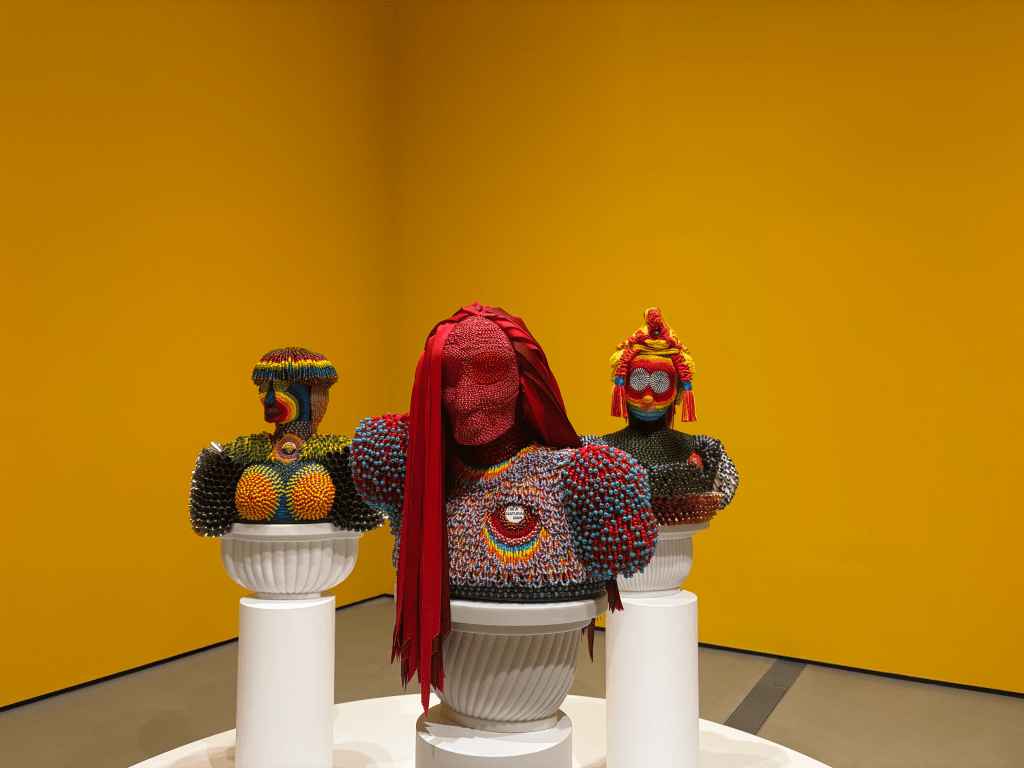 A whirlwind of colors, human figures, and multimedia textures, Jeffrey Gibson’s special exhibit at The Broad is a delightful commentary on the American Indigenous experience. The exhibit begins with a painting quoting a 1902 letter that demonstrates how the state of California repressed Native children, requiring them to cut their hair and assimilate into Western culture, even after they had left the American school system. As the exhibit continues, human figures appear—as they are at the heart of this story. Human figures, with vaguely depicted gender and race, are constructed from beads and ribbons. Some have long hair characteristic of Native people.