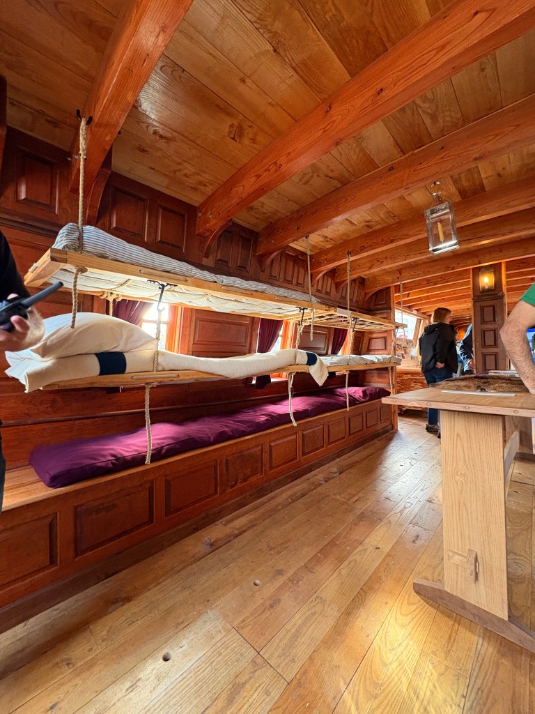 The ship made was a near-exact replica, and its interior reflects its purpose: both honoring the ship’s original design with a working iron stove and bunk beds hanging from the low ceiling, and its role as a museum ship with plaques and images from the design process.
